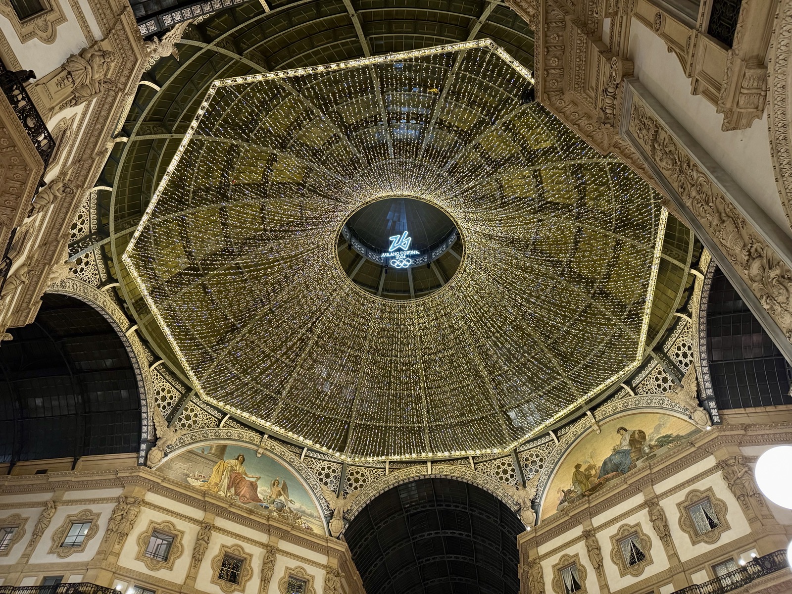 In een lange oranje stoet lopen we terug naar het metrostation en duiken we het centrum van Milaan in. Het is duidelijk zaterdagavond dus er wordt volop geflaneerd. In de straten hangen mooi verlichte pictogrammen van de olympische sporten en in de winkels zijn veel etalages in olympische sferen, ook bij de dure merken in de Galleria Vittorio Emanuelle.